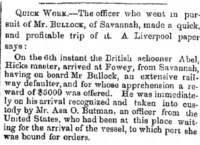 ↩︎ - “Asa O Butman Captured Fugitive in England.” Newspapers.com, May 9, 1850. https://www.newspapers.com/article/milwaukee-daily-sentinel-asa-o-butman-ca/59155202/.
